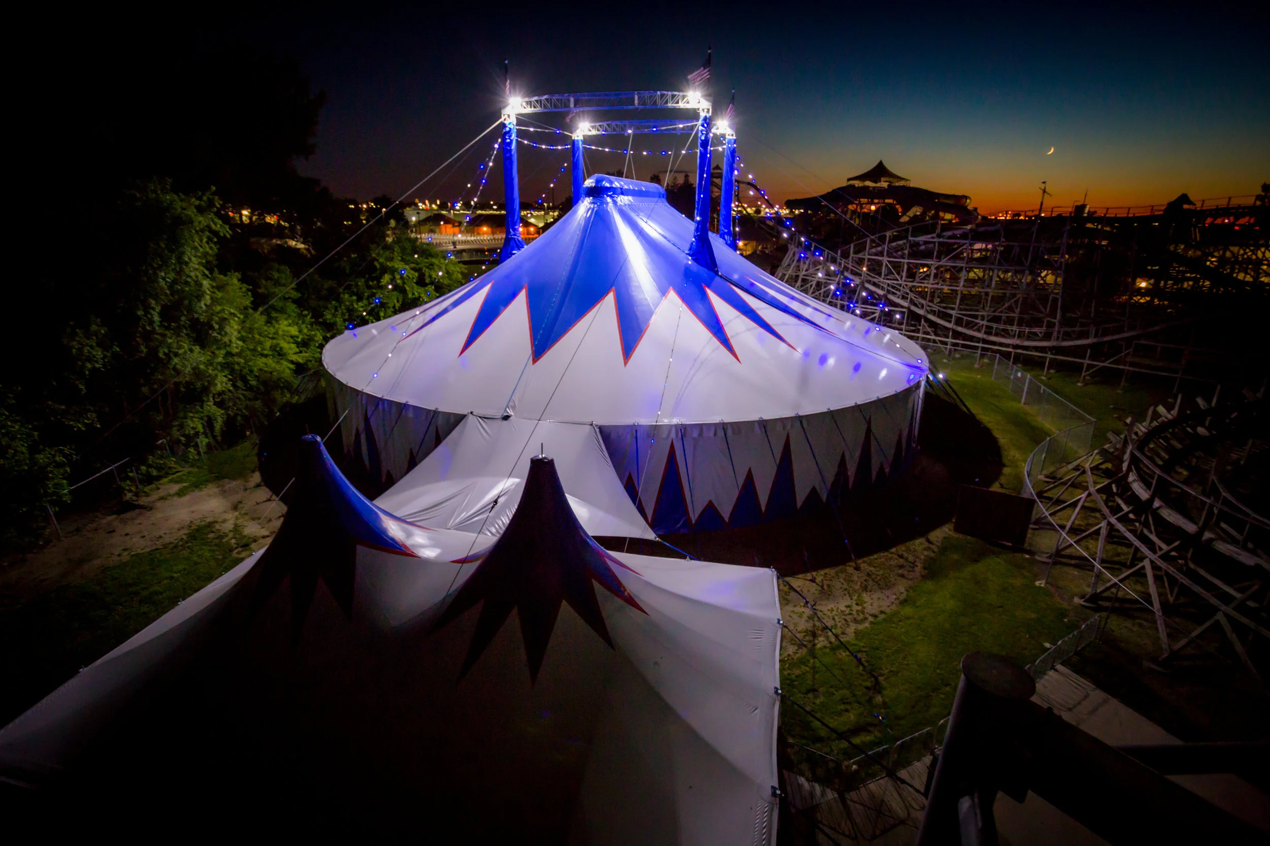 Our Big Top is 102ft round: 4 king poles, 6 perfectly marked emergency exits, blue color on the inside and white, blue, and red on the outside with all fireproof stamps.
